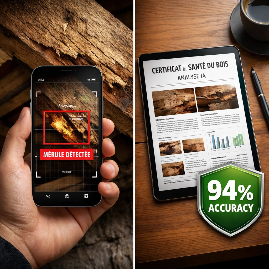 Notre intelligence artificielle specialisee analyse vos photos : merule, insectes xylophages, etat structurel.